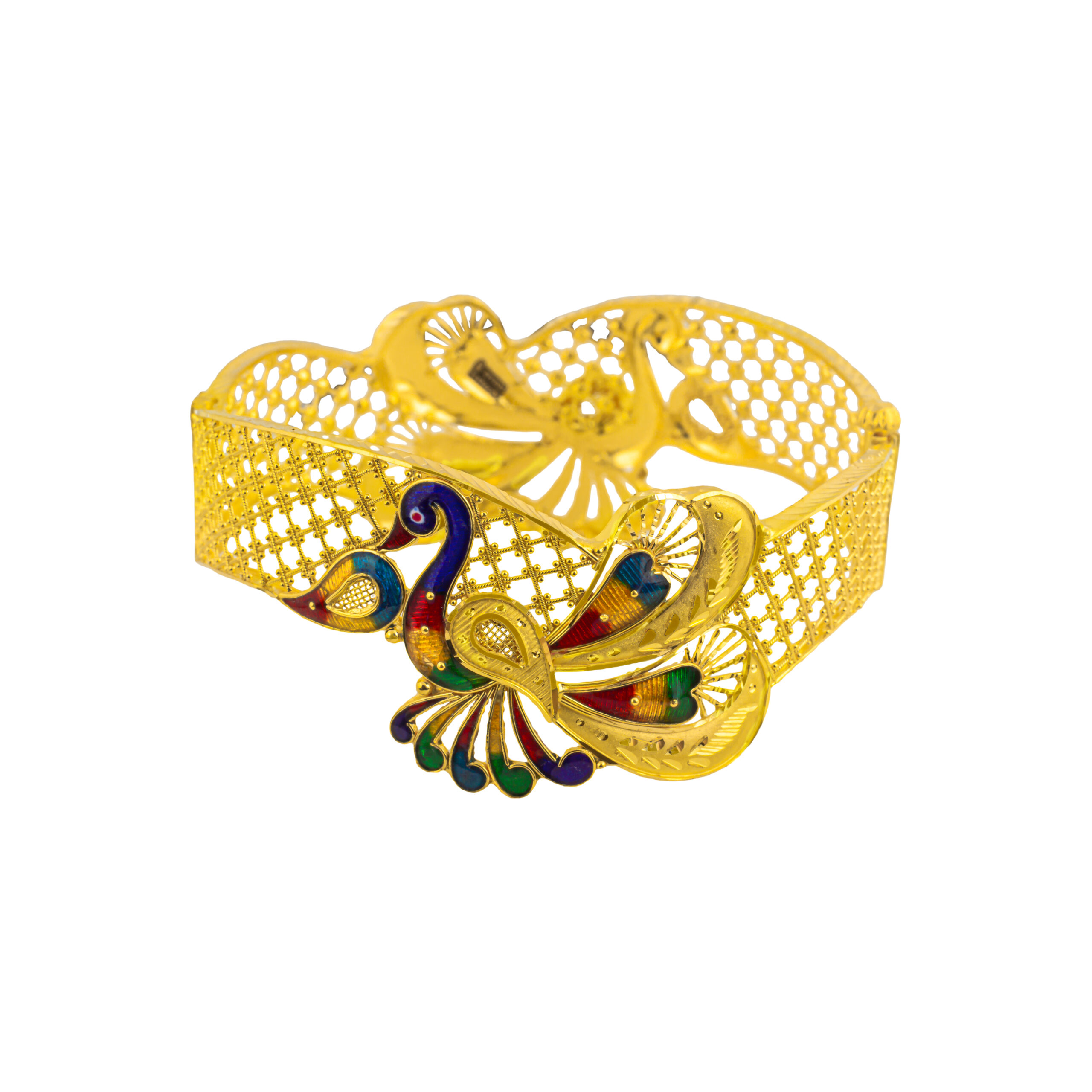 Blending proficiency and creativity, Kharu is the reflection of an ageless craft. Its exquisite designs mirror the cultures and traditions of Bengal. This beautiful wrist-craft delightfully compliments your mehndi-filled hands. Whether you wear it with a saree or lehenga-choli, the opulent Meenakari of this lightweight gold chur design ignites the magnificence of any occasion.